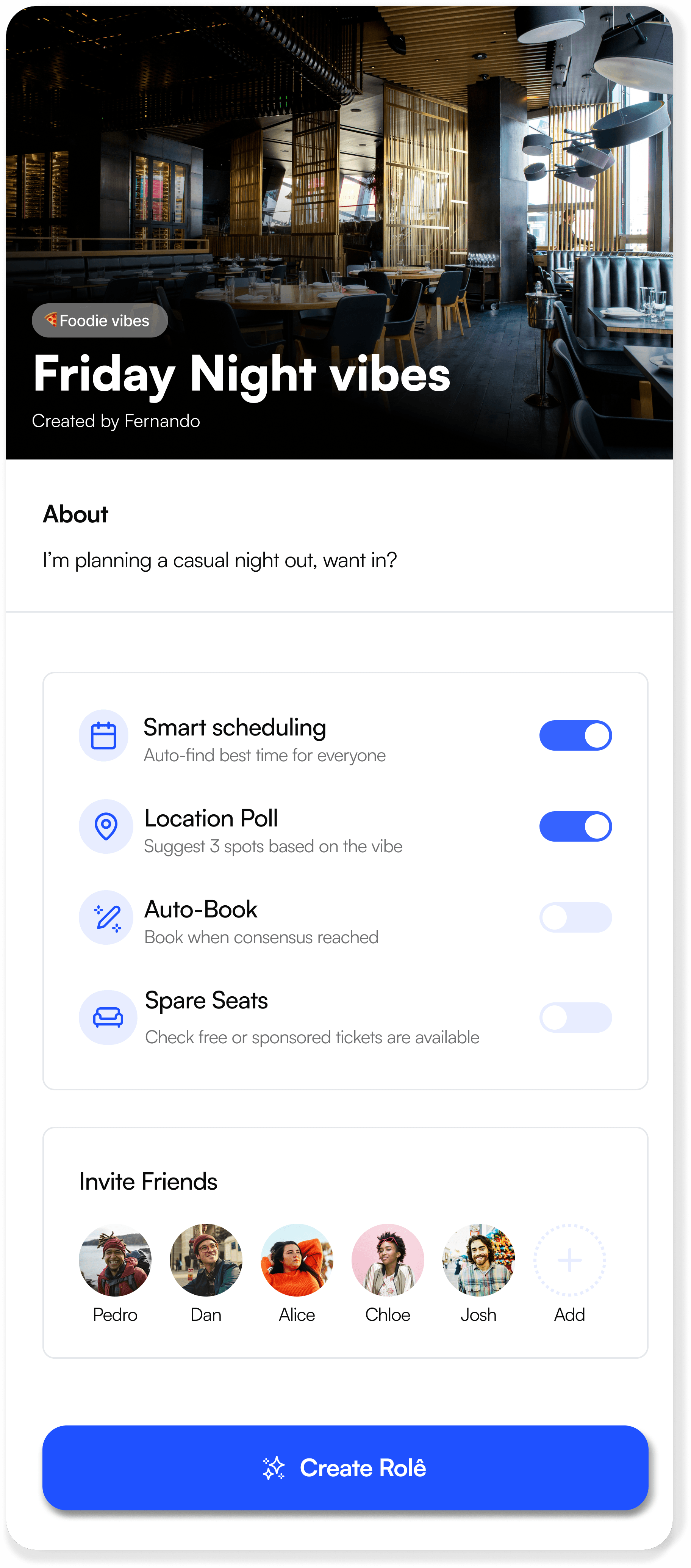 Rolê keeps everything in one place, so choosing, organising, and sharing plans feels natural, not like another task and endless back-and-forth